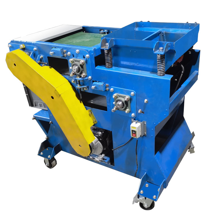 紙帶銅針?lè)蛛x機(jī)/電子腳吸鐵機(jī)采用全磁滾筒,滾筒從下向上轉(zhuǎn)動(dòng),物料從下面給料,磁性物料可以在滾筒的磁場(chǎng)中,吸附到皮帶上面,然后銅直接脫落到銅出口,鐵再次經(jīng)過(guò)皮帶磁選,兩次提純保證了鐵腳的干凈度。